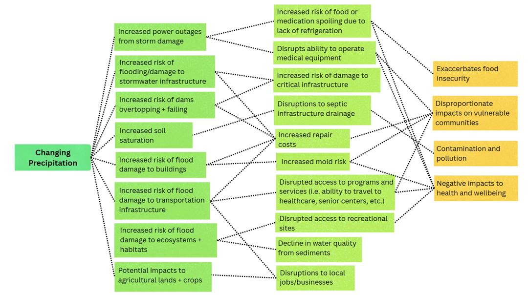 This Climate Impact Chain shows how changes in rainfall—like heavier storms or longer wet periods—can create a ripple effect throughout the community. More intense rain can lead to flooding, power outages, damaged roads and buildings, and problems with stormwater and septic systems. These impacts can affect drinking water, local farms and businesses, access to healthcare and services, and even cause mold or food spoilage during outages. The graphic shows that preparing for changing precipitation in Putnam County means understanding how one storm can set off many connected challenges across the community.