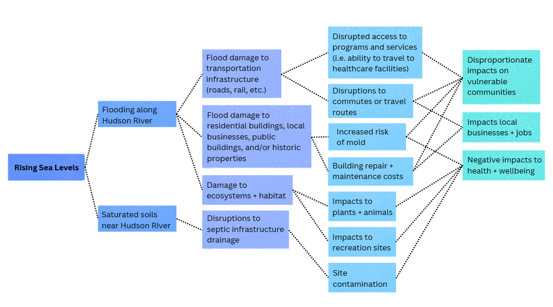 This Climate Impact Chain shows how rising sea levels along the Hudson River can directly affect communities like Philipstown, the Village of Cold Spring, and the Village of Nelsonville who already experience regular riverine flooding. As water levels rise, flooding is expected to happen more often and reach farther inland, damaging roads, homes, local businesses, and historic buildings. It can also overwhelm septic systems, limit access to Metro-North rail lines and key travel routes, and make it harder for residents to reach healthcare and other essential services. The graphic highlights that as river flooding becomes more frequent, it can create ongoing challenges for residents, small businesses, and vulnerable community members throughout these riverfront communities.