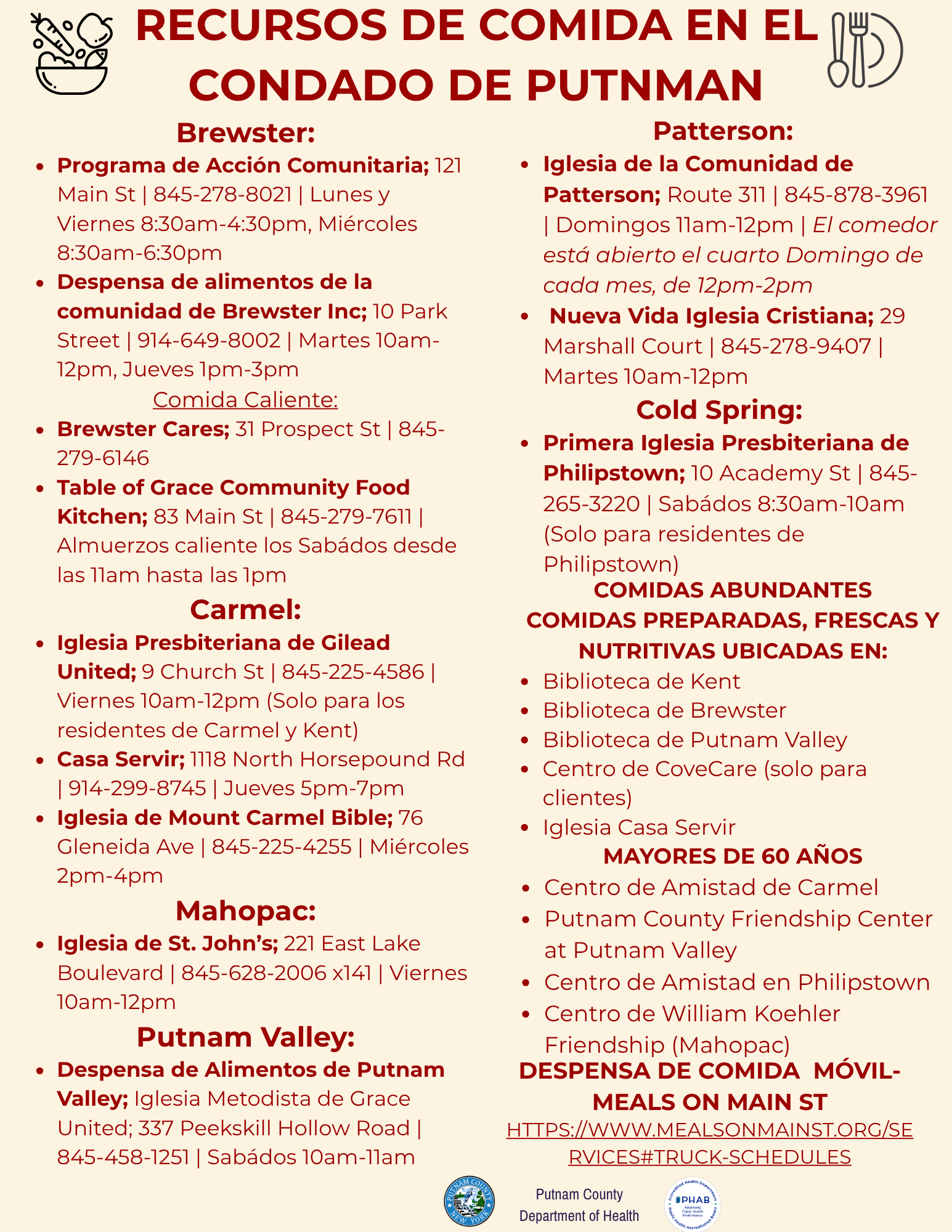 There are several food resources available in Putnam County. The following is a list of food pantries, places that serve warm meals, and locations of freezers with fresh, nutritious meals. Additional resources in Putnam County can be found in the Community Resource Guide and from Cornell Cooperative Extension of Putnam County.