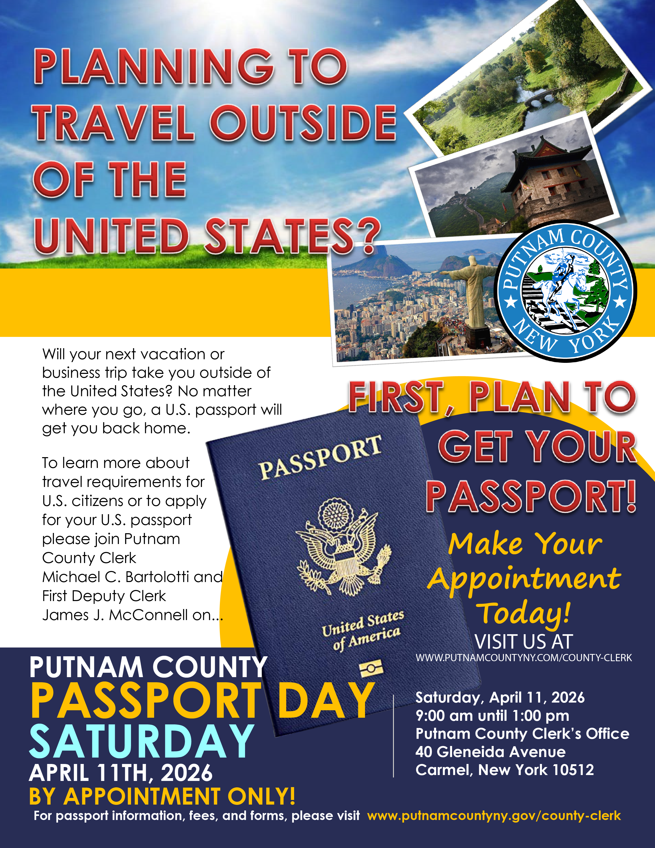 The Putnam County Clerk’s Office is extremely proud to host Putnam County Passport Saturday in April; at the Putnam County Clerk’s Office located at 40 Gleneida Avenue, Carmel, New York on Saturday April 11, 2026, from 9:00 am until 1:00 pm to provide passport information to U.S. citizens and to accept passport applications.