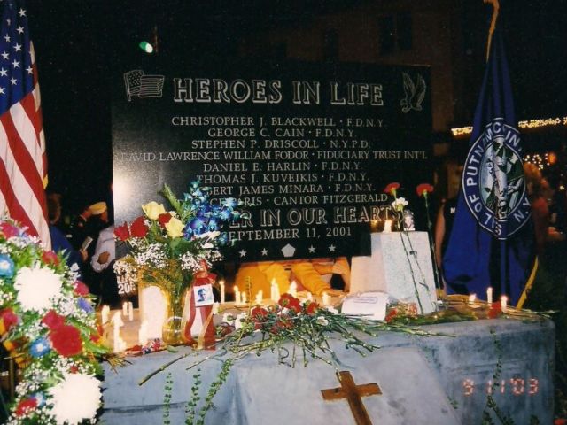 Our Memorial honors the Eight Putnam Heroes who died on September 11th, 2001, and the Fifteen Putnam Heroes who have passed as a result of their efforts in the aftermath of September 11th. This year sadly, we will be adding one more name onto our Memorial, FF Mark Senno, FDNY