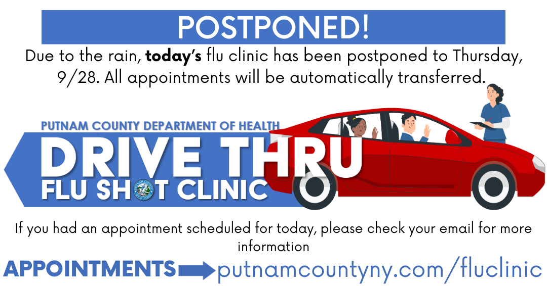 The PCDOH has cancelled today’s flu clinic. All scheduled appointments have been automatically rescheduled for the rain date of Thursday, September 28. All registrants have been emailed with instructions to reschedule if that time is no longer convenient.