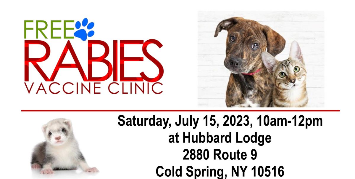 Attention Putnam Residents! Bring your dogs, cats, and ferrets to a FREE rabies vaccination clinic on Saturday, July 15th from 10am-12pm. Sponsored by the Putnam County Department of Health, the clinic is being held at Hubbard Lodge, 2880 Route 9, Cold Spring and is open to all Putnam County residents.