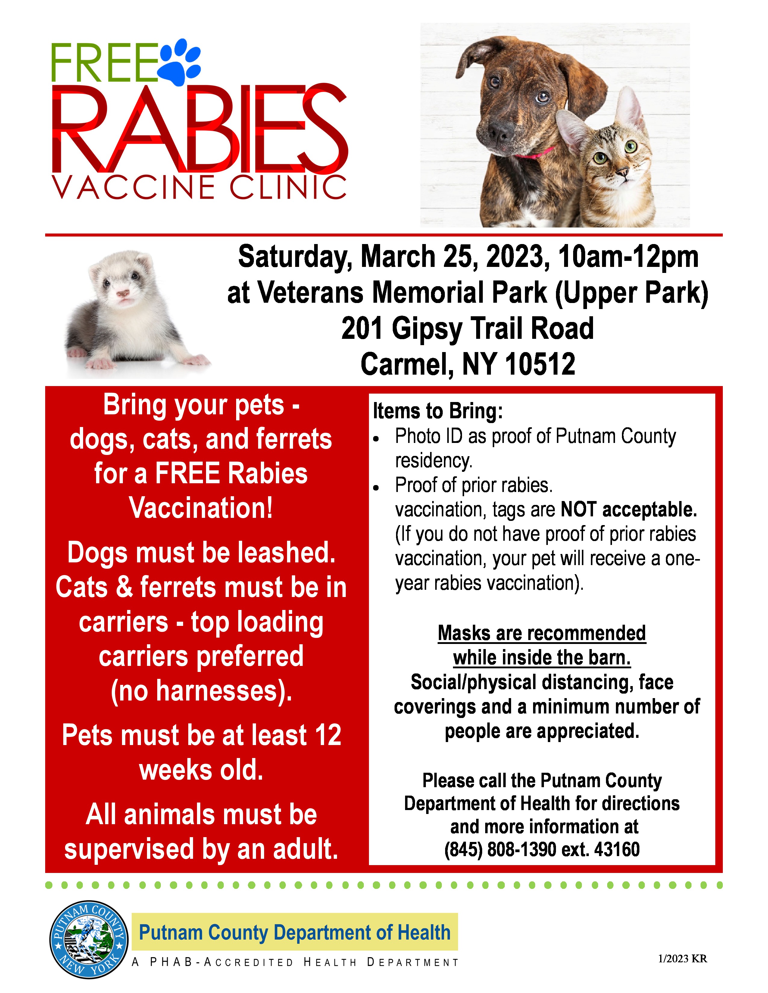 Attention Putnam Residents! Bring your dogs, cats, and ferrets to a FREE rabies vaccination clinic on Saturday, March 25th from 10am-12pm. Sponsored by the Putnam County Department of Health, the clinic is being held at Putnam County Veterans Memorial Park (Upper Park), 201 Gipsy Trail Road, Carmel, and is open to all Putnam County residents.