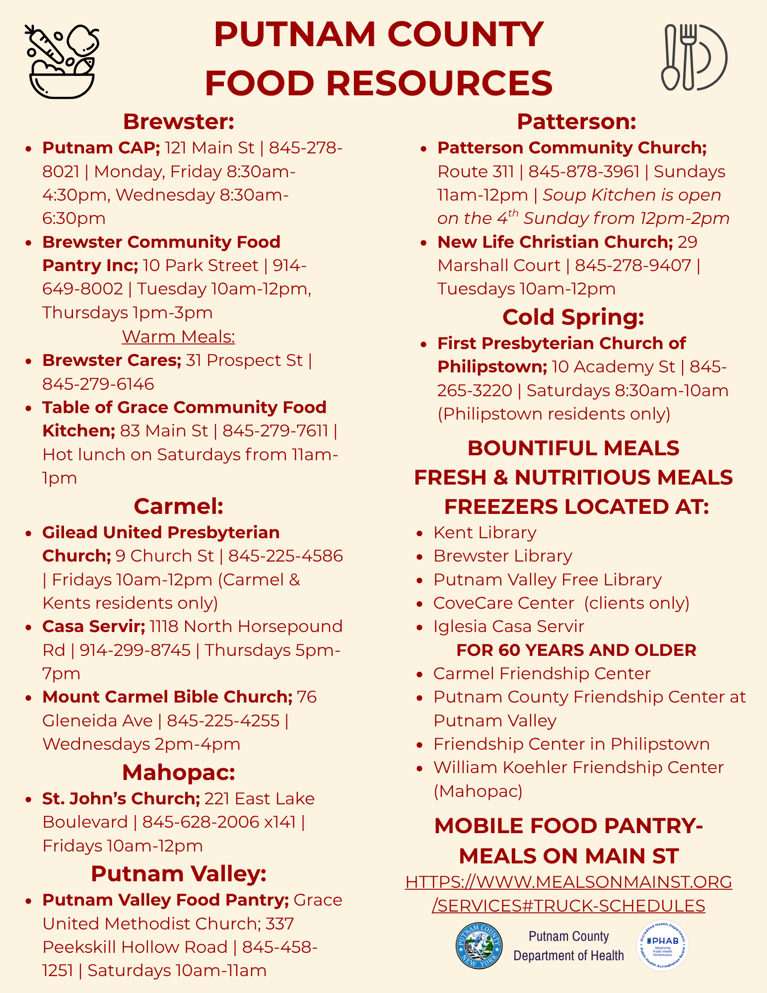 There are several food resources available in Putnam County. The following is a list of food pantries, places that serve warm meals, and locations of freezers with fresh, nutritious meals. Additional resources in Putnam County can be found in the Community Resource Guide and from Cornell Cooperative Extension of Putnam County.