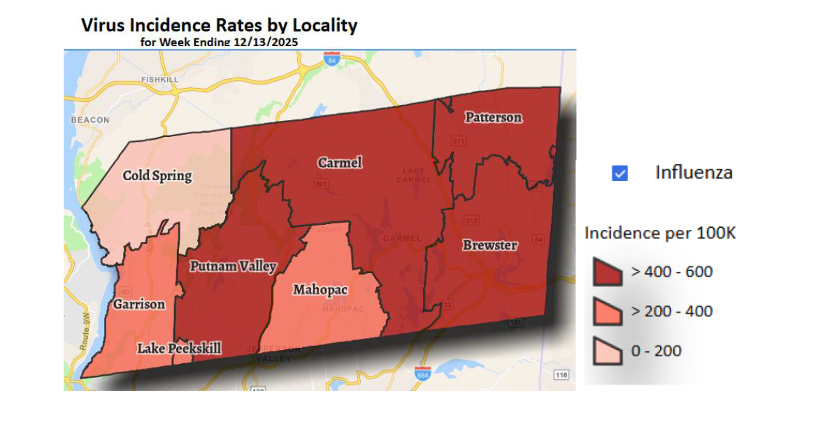 With the latest reports on flu case numbers from the New York State Department of Health, it’s official: the respiratory virus season is here! Numbers tallied for the first week of December show flu on the rise— 57 percent higher in Putnam County than the previous week and 29 percent higher in New York State than the previous week. In Putnam, RSV cases held steady from the previous week and COVID cases increased 45 percent. In comparison, New York State numbers showed a 35 percent increase in RSV and a 15 percent increase in COVID cases. These numbers fluctuate and are updated weekly on the health department’s respiratory virus dashboard.