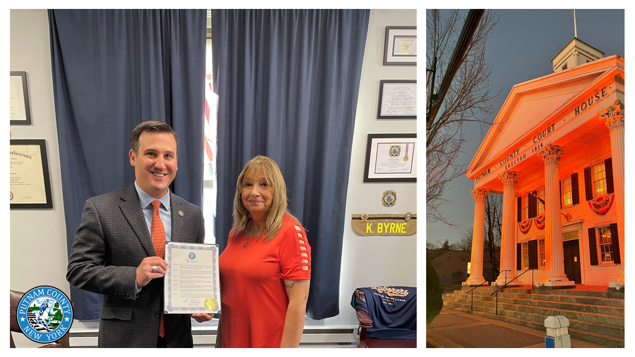 Last week, Putnam County Executive Kevin Byrne signed a proclamation recognizing CRPS/RSD Awareness Day, demonstrating the county’s commitment to raising awareness for Complex Regional Pain Syndrome (CRPS), also known as Reflex Sympathetic Dystrophy (RSD). In support of this cause, Byrne directed the Department of Public Works to illuminate the County Historic Courthouse in orange, the color symbolizing CRPS/RSD awareness.