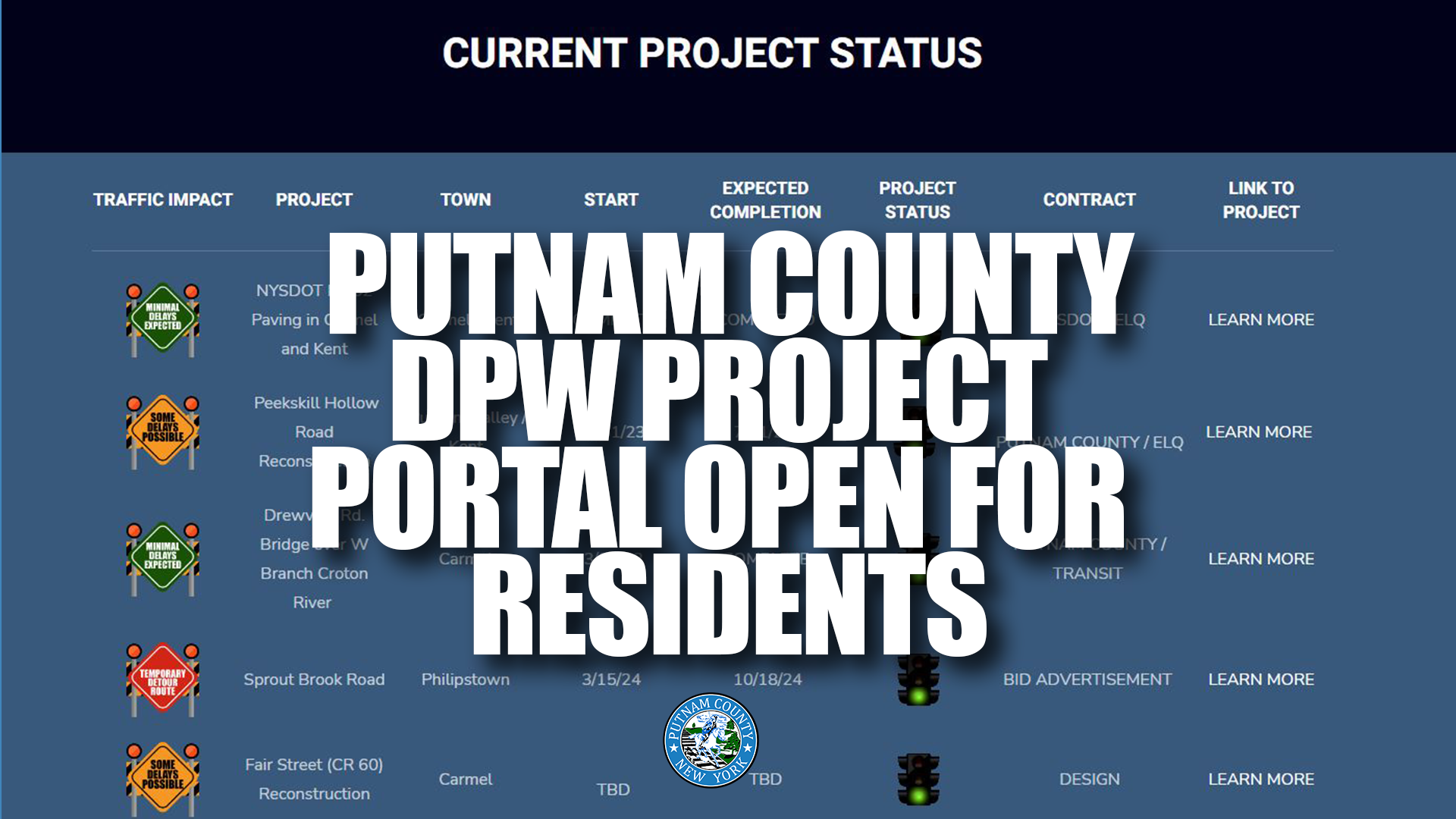 Residents are encouraged to visit the Road Construction Project Portal at www.putnamcountyny.com/public-works/projects on the county website to stay informed about ongoing road projects and track their progress.