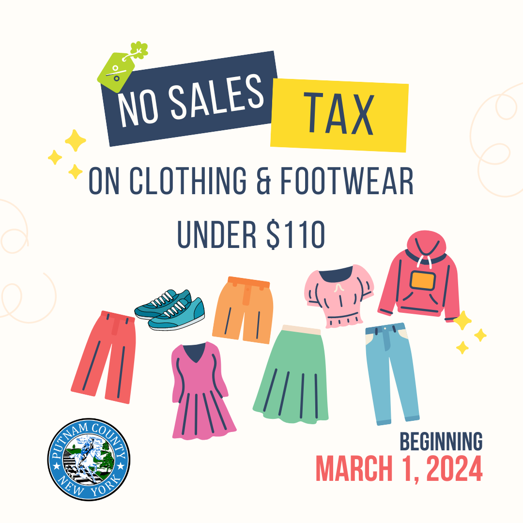 Carmel, NY – Effective today, clothing and footwear under $110 purchased within Putnam County will be exempt from sales tax. Last year, Putnam County Executive Kevin Byrne signed legislation creating the two year sales tax exemption. The resolution enacting the measure was passed unanimously by the Putnam County Legislature in November of 2023 as part of a series of initiatives in the 2024 County Budget.